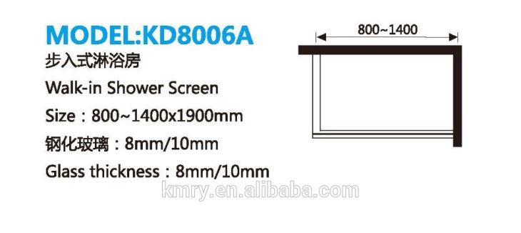 Taille: (800 ~ 1400) × (1900 ~ 2100) mm, facultatif. Numéro de modèle: KD8006A Épaisseur de verre: 8 mm / 10 mm Matériau de panneau: verre trempé Style ouvert: un panneau fixe, entrez DIN EN 12150; AS / NZS 2208: 1996; ANSI Z97. 1-2004; BS6206